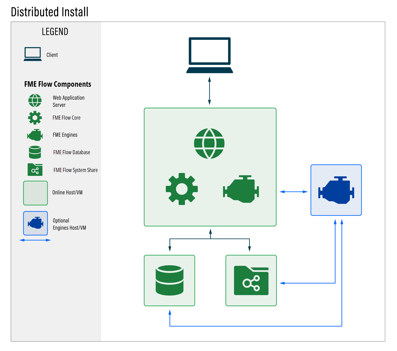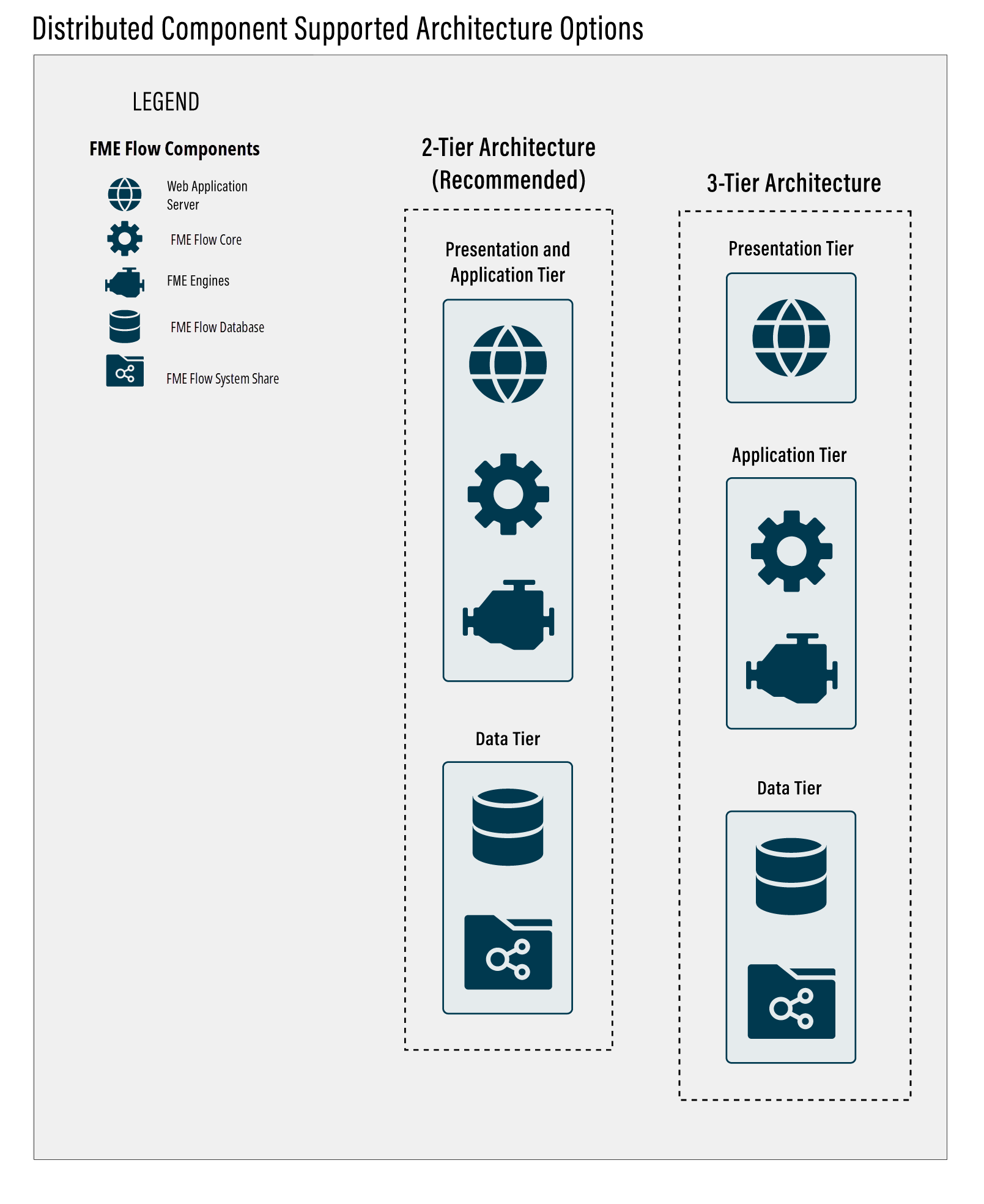 You can distribute the components of an FME Flow installation to achieve an n-tier architecture. Both 2-tier and 3-tier configurations are supported: