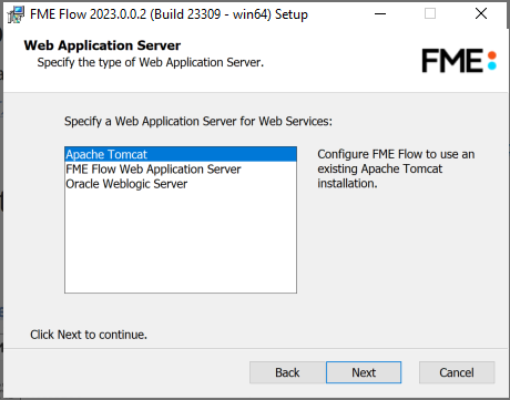 - This option is supported, but not described in Distributing FME Flow Components. Do not select FME Flow Database if you already completed the previous step, Install the FME Flow Database, or if you plan to configure the FME Flow Database on your own database server. If you specify FME Flow Web Application Server under Web Application Server (below), the installation is equivalent to an Express installation.