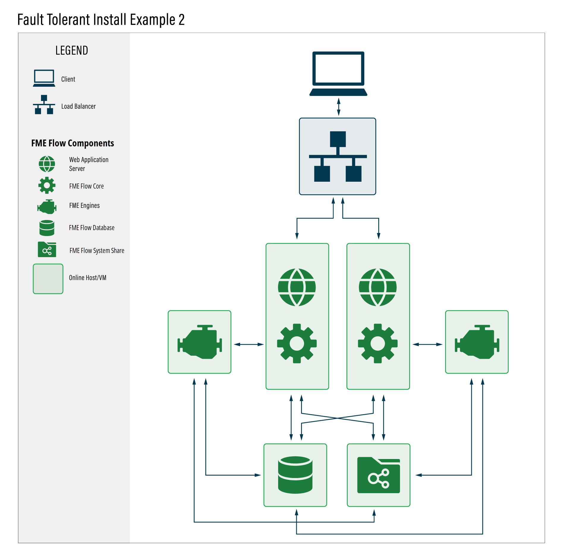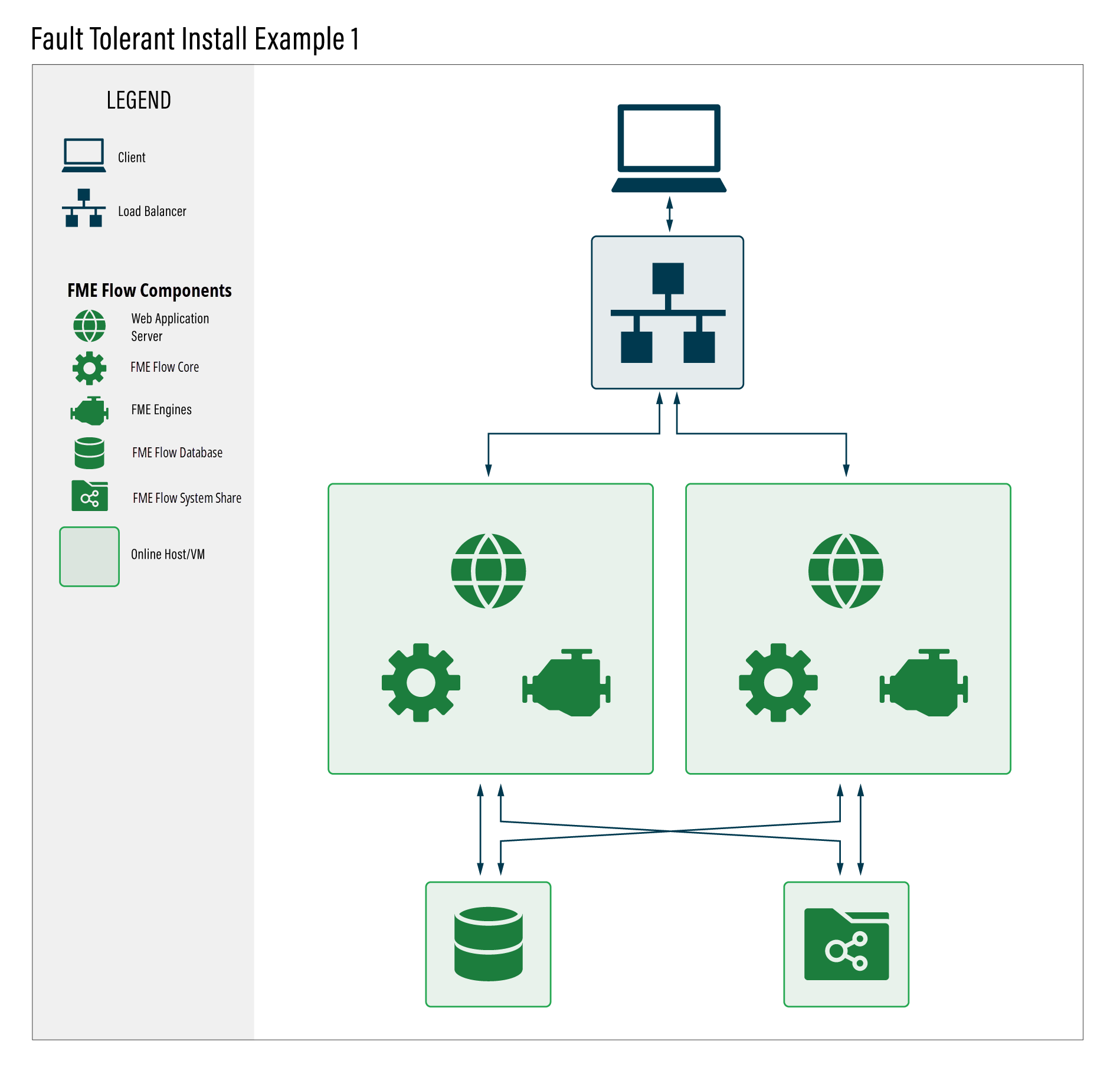 Organizations are expected to maintain the FME Flow Database and FME Flow System Share (a file system for hosting Repositories and Resources) on their own fault-tolerant servers. This ensures the fault-tolerant FME Flow has reliable access to workspaces, repositories, resources, and other items.