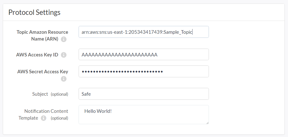 - Notification Content Template contains the default message you want to publish to the Amazon SNS topic. The message can be up to 64 KB of Unicode text.