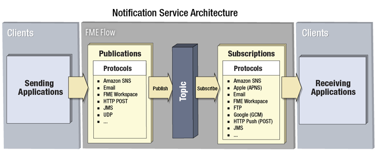 Publishers receive content from an FME Workspace, or from other clients over a supported protocol, and deliver the content as notifications to topics.
