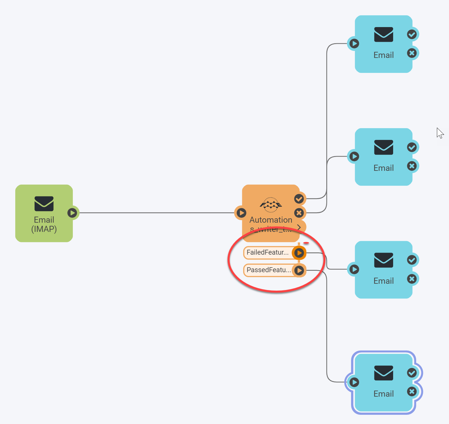 Notice that the Run a Workspace action has two additional output ports (circled). The name of each additional output port matches the name of its corresponding feature type, as defined by the FME Flow Automations writers. (Also notice that, in addition to the messages sent from these additional ports, the workflow sends messages based only on whether the workspace runs successfully or not.)