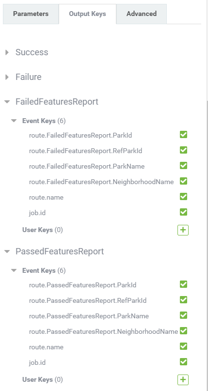 For example, consider a workflow that receives emails and runs a workspace, which performs some sort of validation on attached files from the emails. Features in the attachment that pass validation are read into a database. With the addition of FME Flow Automations writers, you can configure the workflow to send messages on the results of the validation, including details on feature type attributes. You can send one message about features that passed validation and were read into the database, and another message about features that failed validation. In the workspace, these messages correspond to the output written to two Automations writers, as seen here: